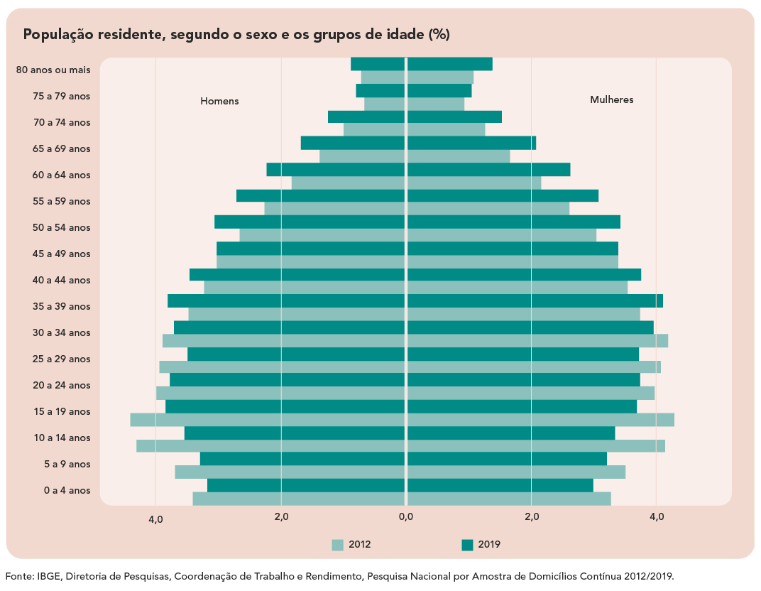 Essa é a pirâmide do Brasil, no ano de 2020, segundo o Instituto Brasileiro de Geografia e Estatísticas (IBGE), órgão do governo que faz todos os tipos de estatísticas populacionais.